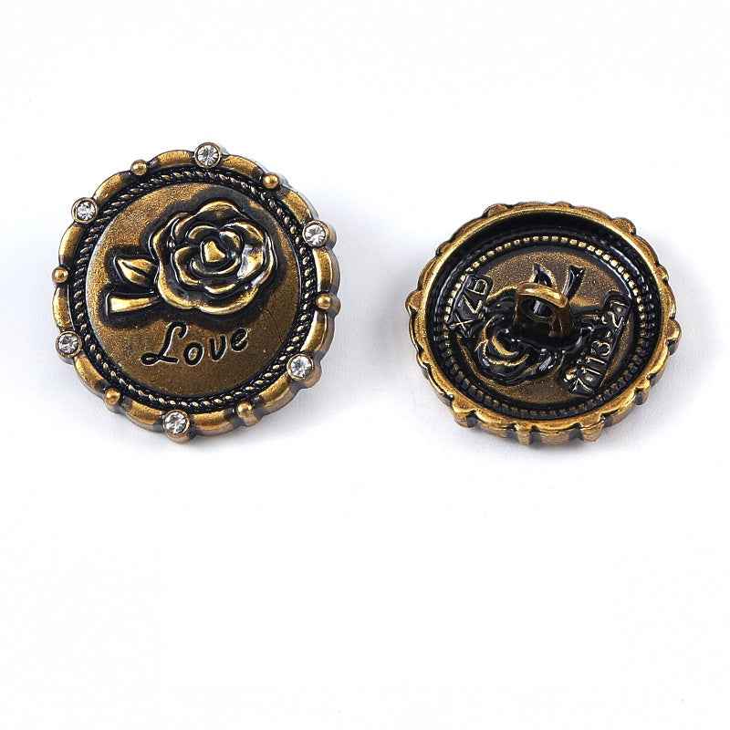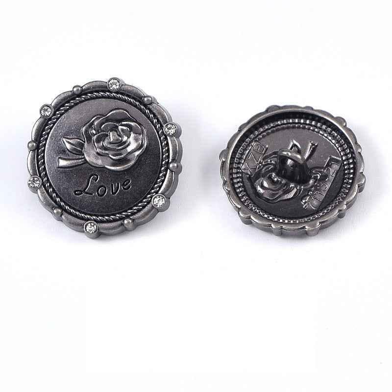 Adaugă eleganță regală designurilor tale cu aceste butoane exquisite cu motiv de trandafir, disponibile în trei mărimi impunătoare (28L/18mm, 34L/22mm, 36L/23mm). Fiecare buton prezintă un design 3D de trandafir lucrat cu migală, împodobit cu strasuri sclipitoare, așezat pe o bază metalică aurie antică sau argintie pentru un finisaj cu adevărat luxos.