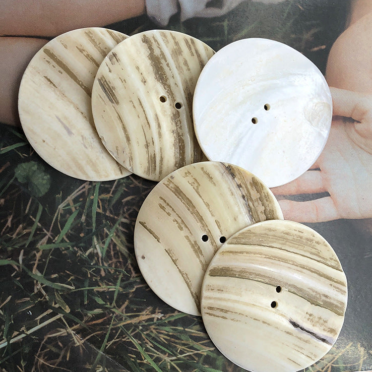 Fiecare nasture are un finisaj neted, lustruit și o formă rotundă clasică cu două găuri pentru o coasere ușoară. Variațiile naturale de culoare și textură fac fiecare nasture unic, adăugând un sentiment personalizat și luxos designurilor dumneavoastră.
