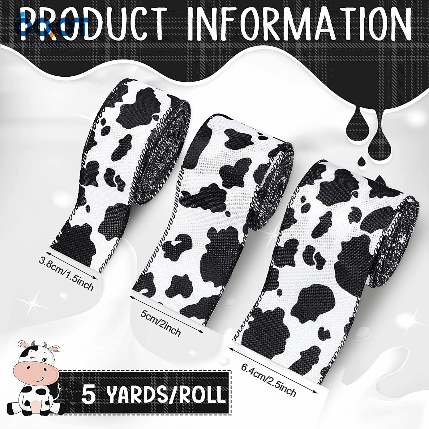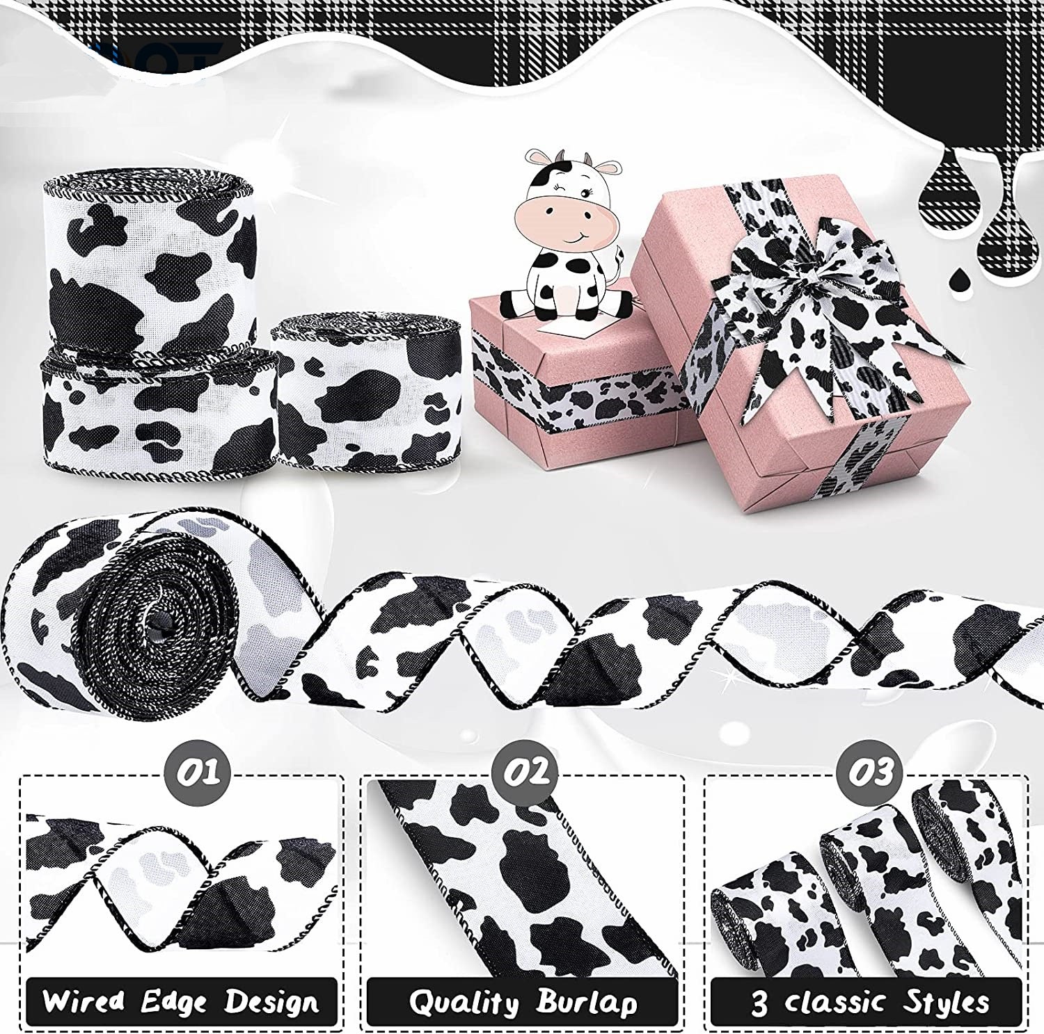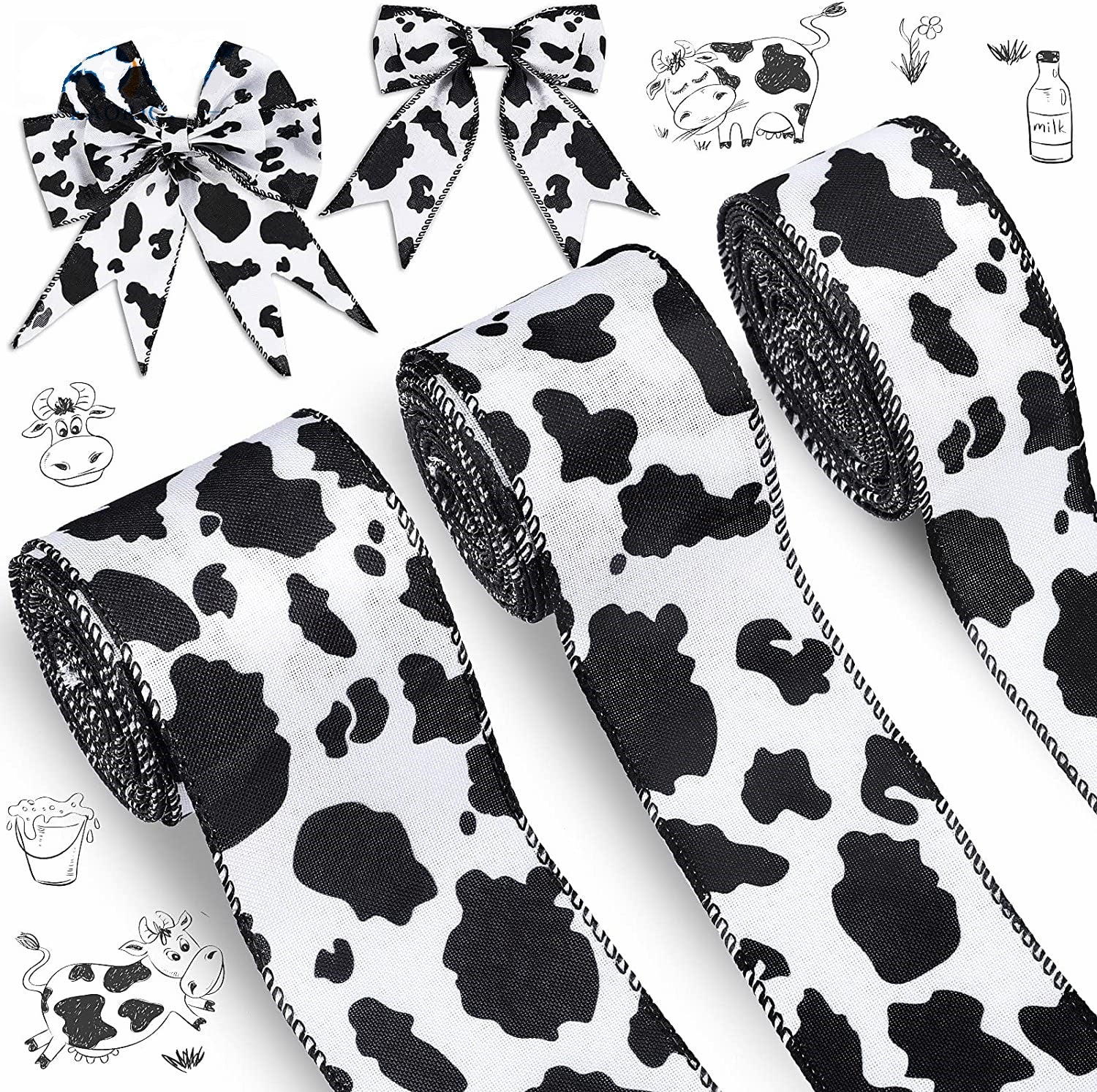 Bandă tiv cu margine de sârmă 40/50/63mm Temă imprimeu vacă Panglică 3 pachete 15 yarzi