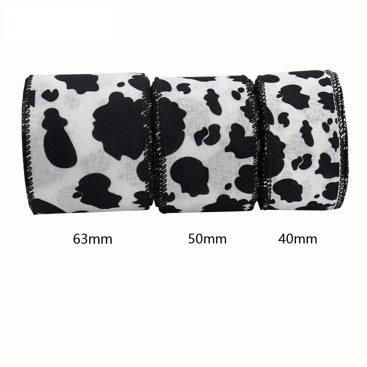 Panglică cu Margine de Sârmă 40/50/63mm - Temă Imprimeu Vacă Alb și Negru, Set de 3 bucăți, 15 Yarzi (5 Yarzi pe Rola)