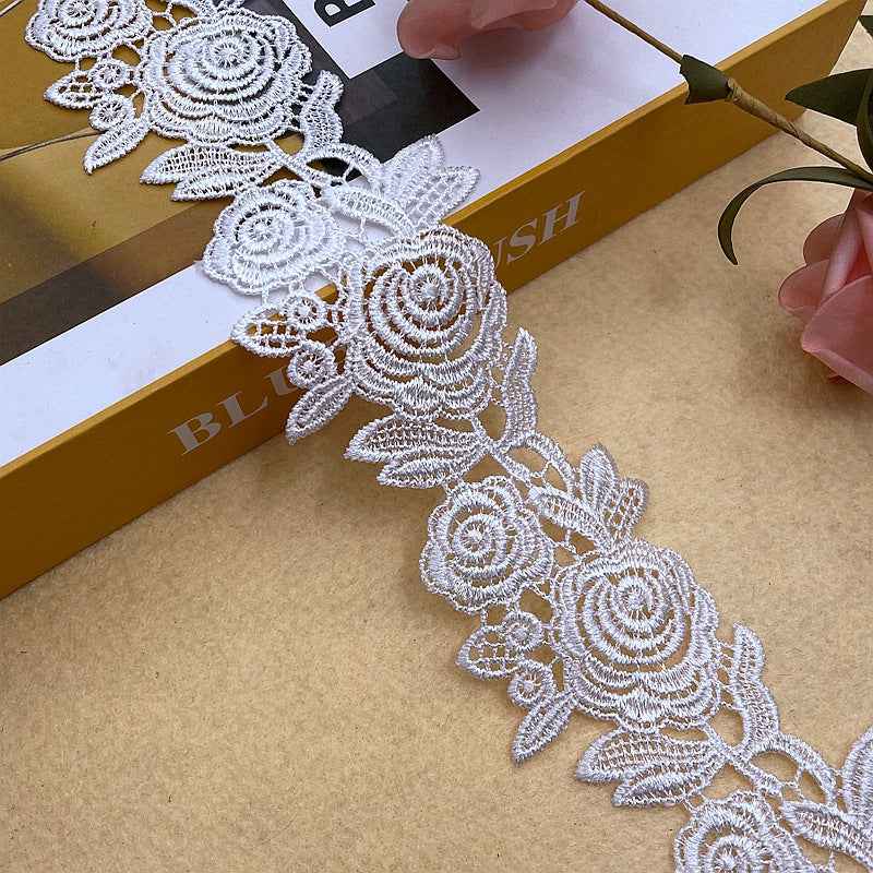 Adaugă o notă de eleganță atemporală designurilor tale cu această dantelă brodată solubilă în apă, cu flori albe, din poliester, lată de 6 cm. Această dantelă rafinată prezintă broderii delicate florale pe o bază moale din poliester, oferind un aspect rafinat și versatil. Caracteristica solubilității în apă permite personalizarea ușoară, fiind perfectă pentru aplicații creative precum broderie, aplicații sau proiecte DIY. Ideală pentru rochii de mireasă, rochii de seară sau decorațiuni interioare, această dantelă adaugă o notă de sofisticare oricărui proiect. Cu o lungime generoasă de 15 yarzi, vei avea suficient material pentru a împodobi rochii, accesorii sau obiecte decorative. Ușoară, durabilă și versatilă, această dantelă este un must-have pentru a adăuga o notă rafinată și artistică creațiilor tale. Ridică-ți designurile cu această dantelă frumoasă chiar azi!