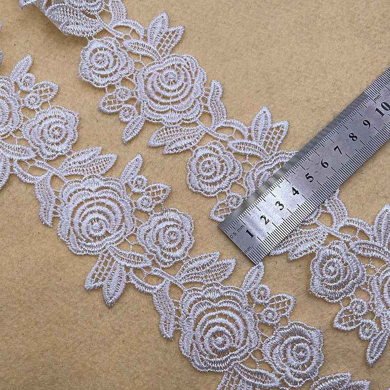 Dantelă brodată din poliester alb cu flori, 6 cm, 15 yarzi