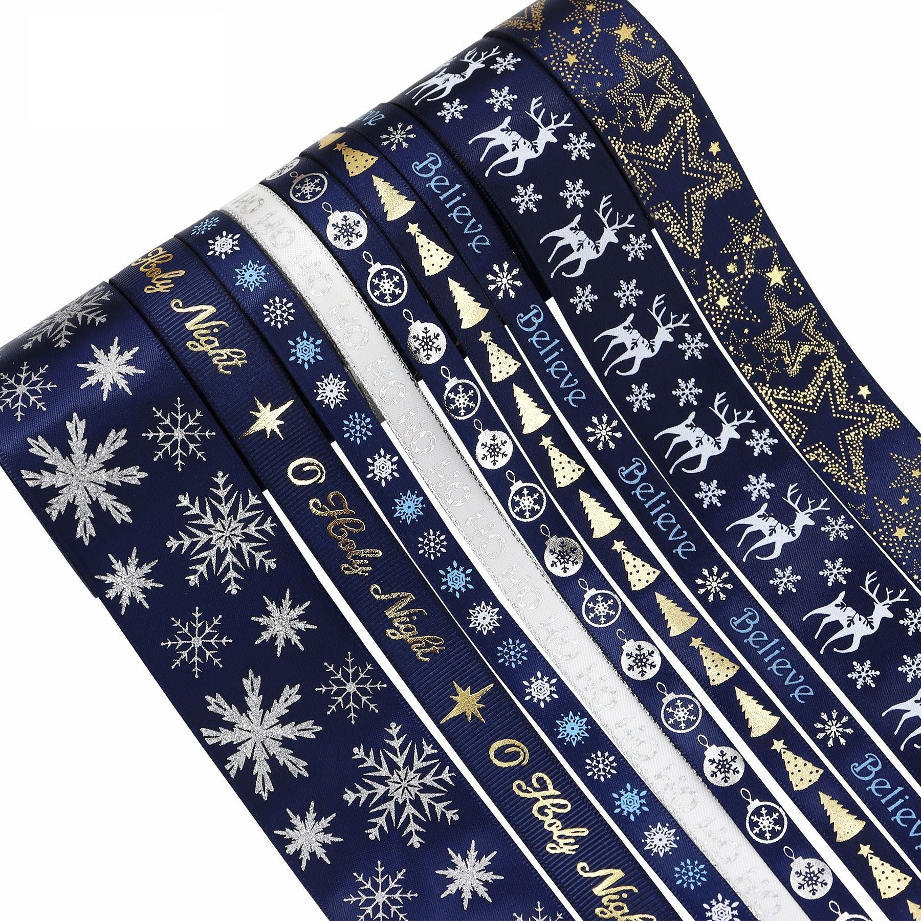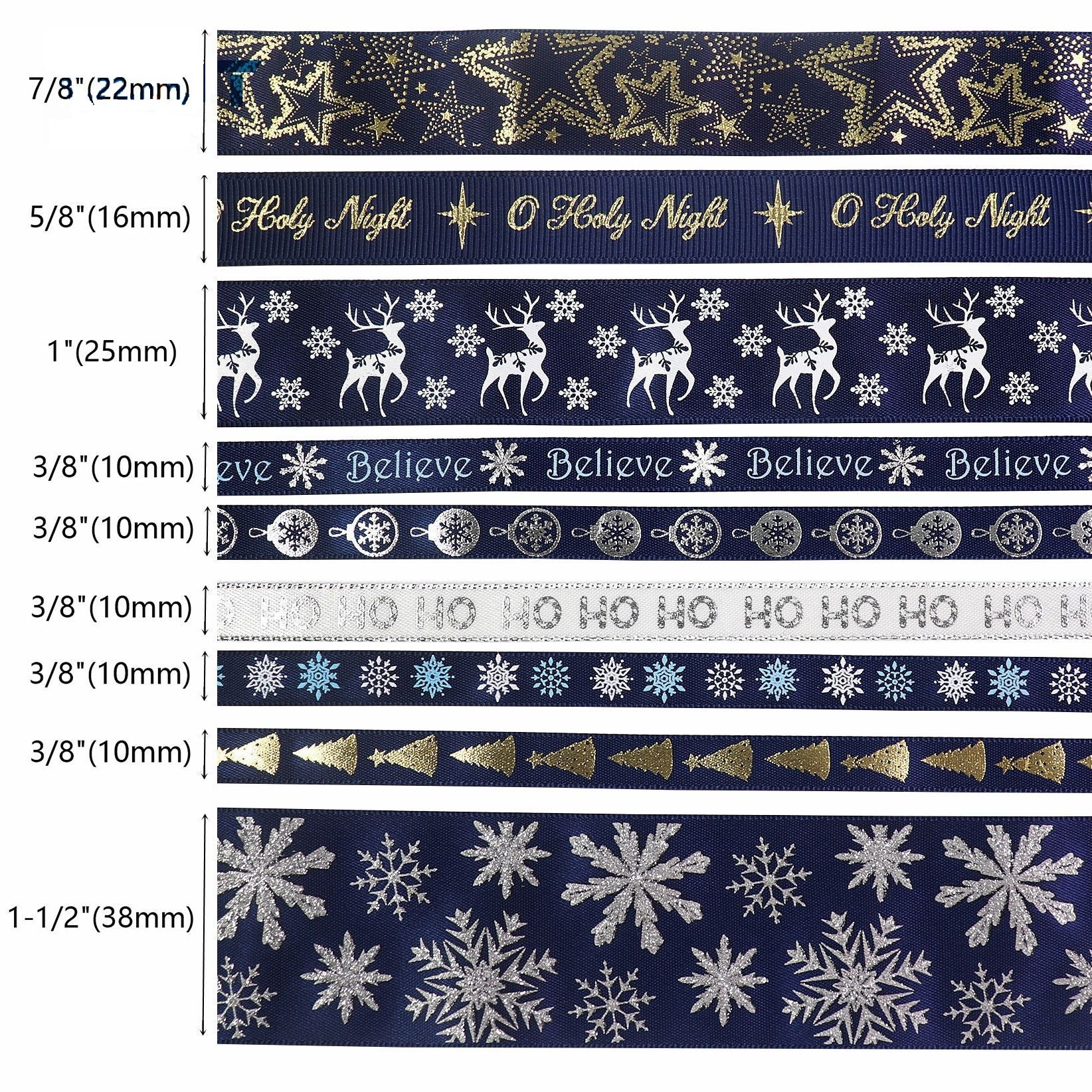 Panglici albastre de Crăciun 10/16/22/25/38mm pentru creații de sărbători, set de 9 bucăți, 45 de yarzi (5 yarzi pe rolă)