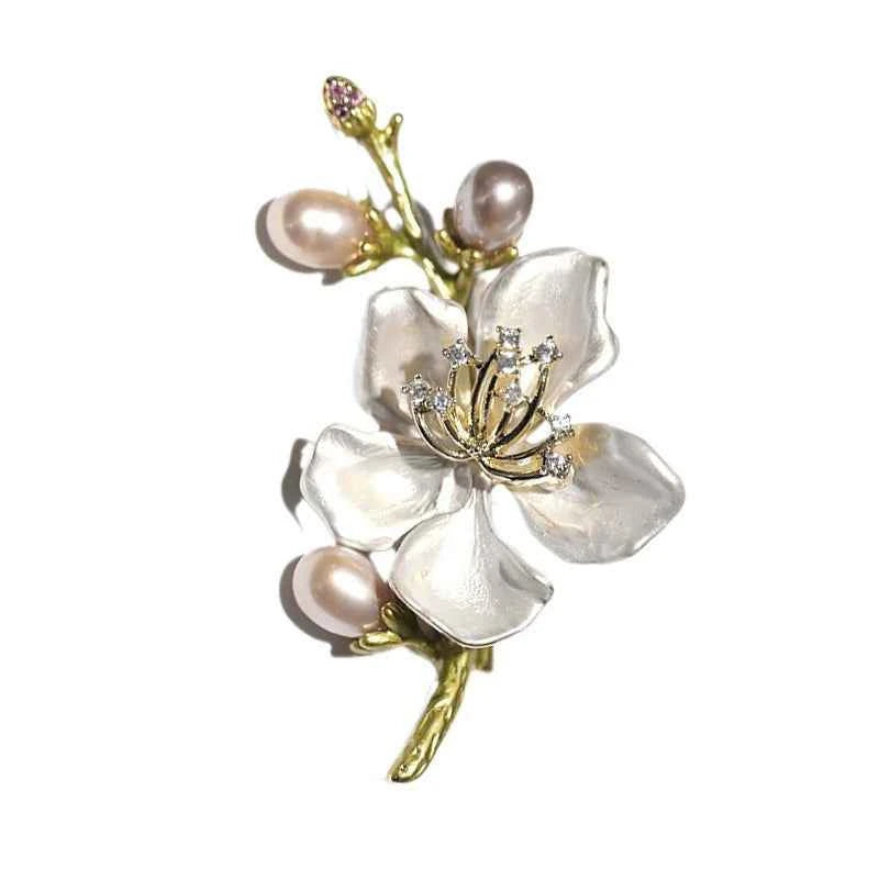 Brosa clasică din email cu perlă de apă dulce și floare de piersic