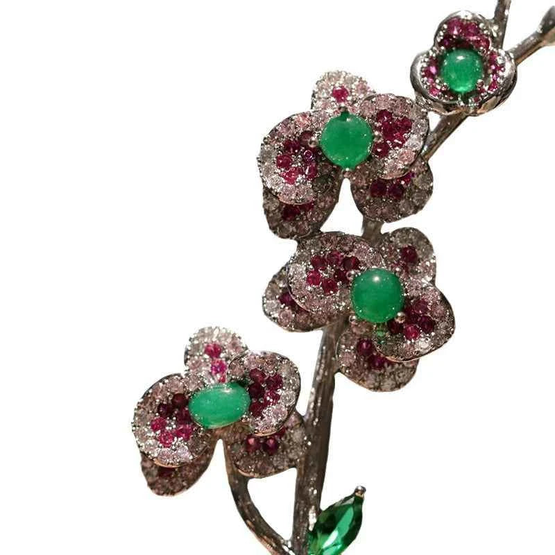 Brosa cu ac din cupru cu zirconiu, floare de prună, agat verde și perlă de apă dulce