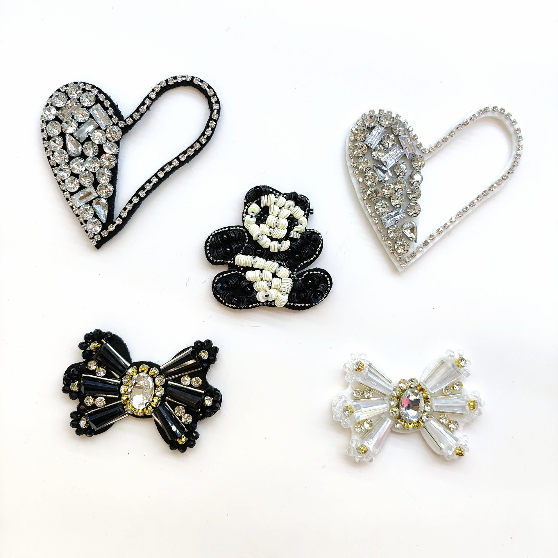 Patch-uri din material cu inimă neagră și albă, lucrate manual, cu mărgele, set de 5 bucăți