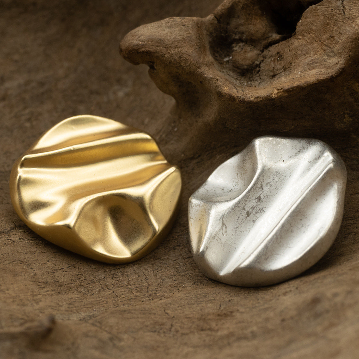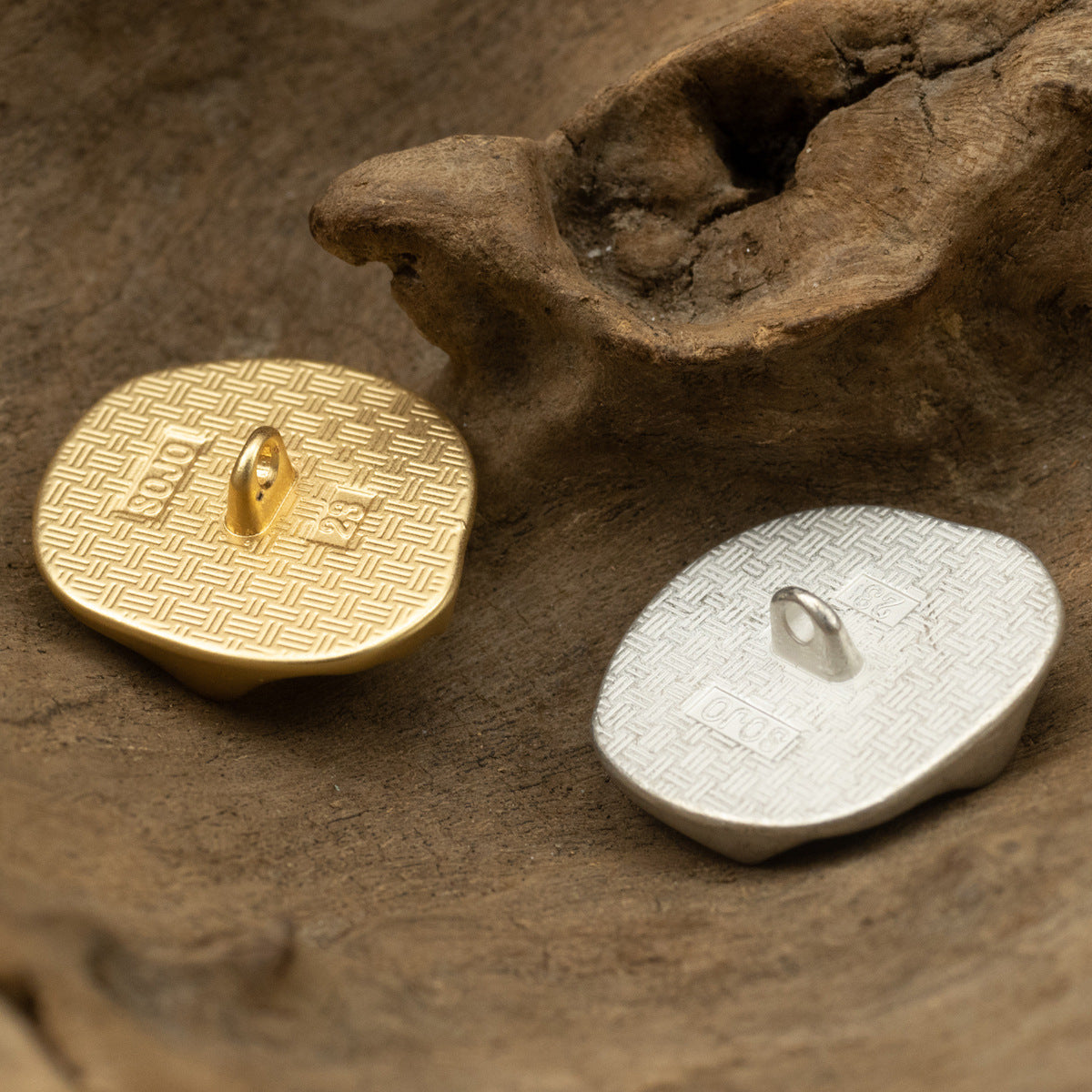 Combinația de argintiu-mat alb și auriu conferă acestor nasturi un aspect luxos și sofisticat. Forma geometrică neregulată îi face să iasă în evidență și adaugă o notă artistică.