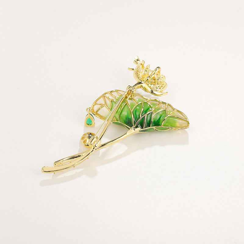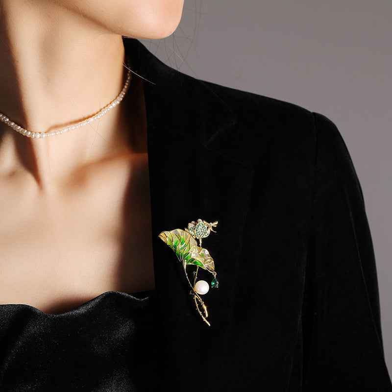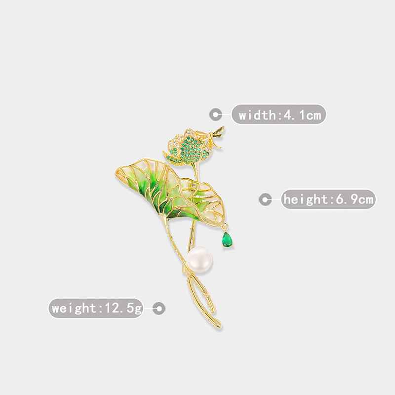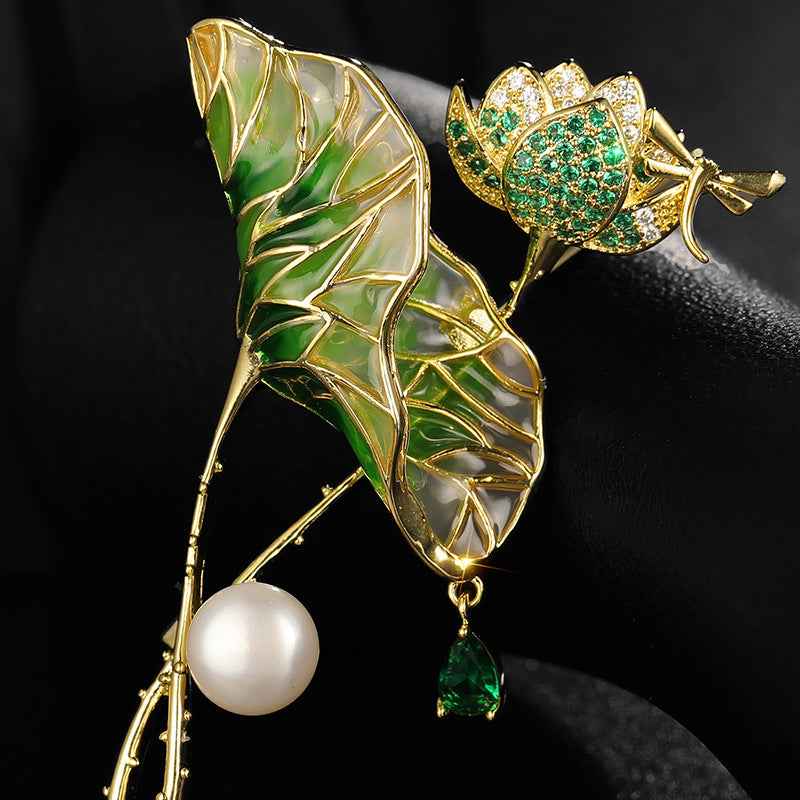 Brosa ac de rever cu perlă în formă de picătură de apă, frunză de lotus smălțuită verde deschis și zirconiu