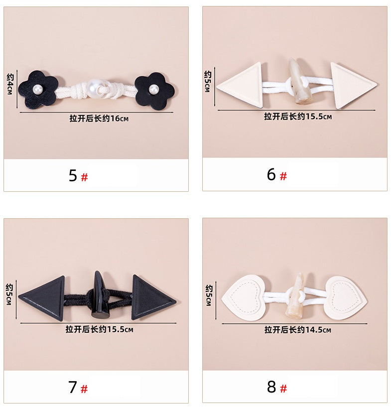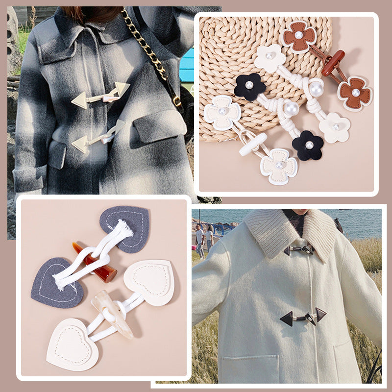 Acest set unic de capse pentru paltoane are nasturi din corn de rășină care emană un farmec rustic. Combinate cu un nasture retro în formă de inimă din piele naturală și un șnur decorativ, adaugă o notă elegantă oricărui palton. Nasturii din corn de rășină au un aspect și o textură naturală, oferind o senzație vintage. Nasturele în formă de inimă din piele naturală este moale la atingere și adaugă o notă de lux. Șnurul decorativ îmbunătățește estetica generală.