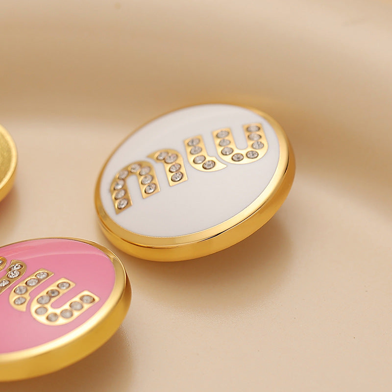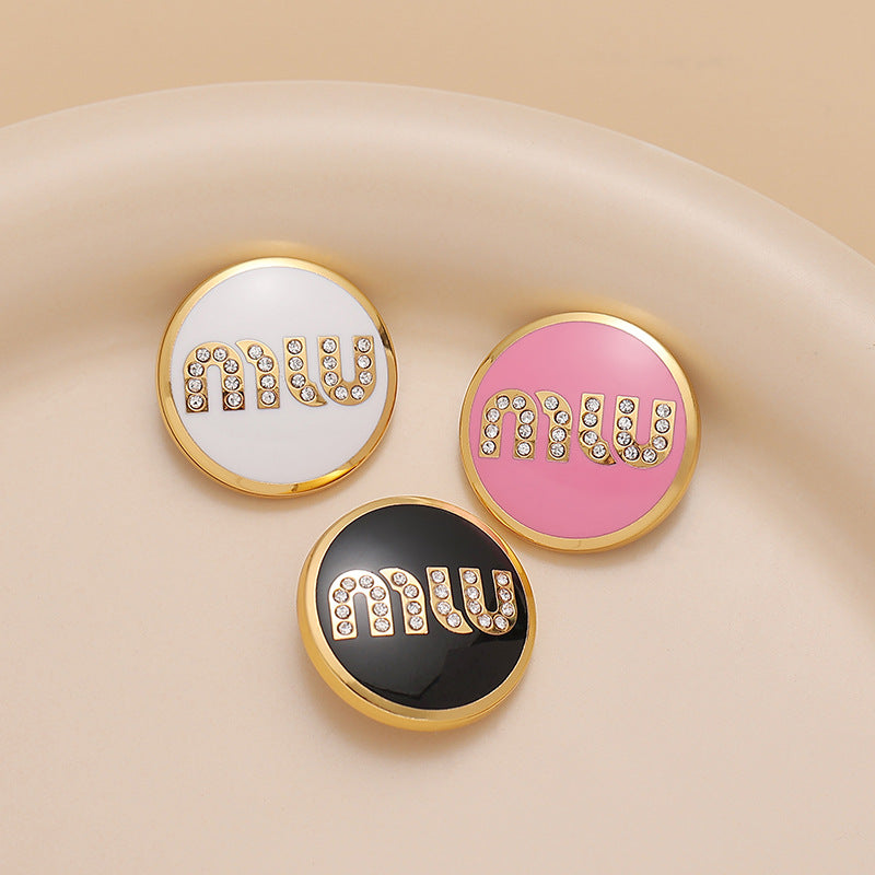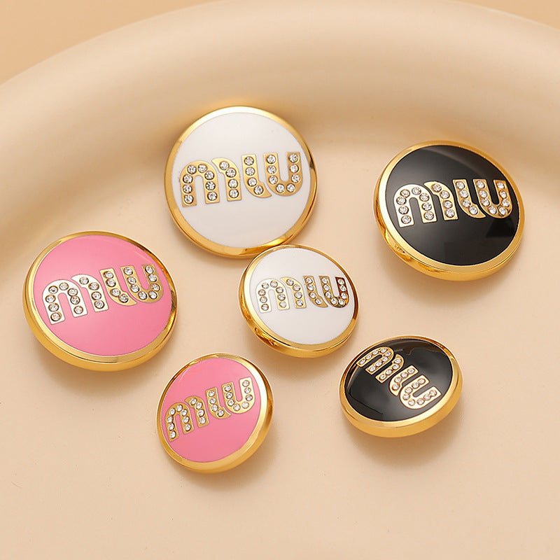 Nasture rotund din metal pentru cusut 18/23mm cu litere MIU și diamante în lac negru, alb și roz, 3 bucăți