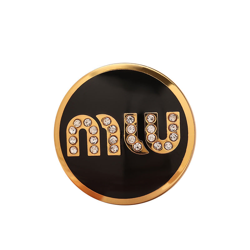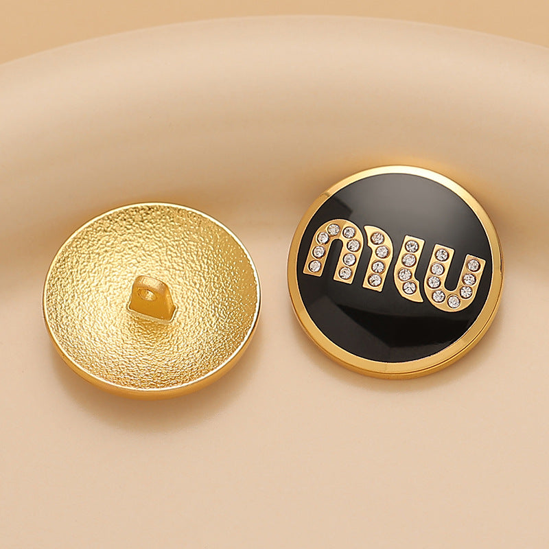 Acest nasture rotund din metal pentru cusut este o piesă cu adevărat remarcabilă. Împodobit cu literele MIU și încrustat cu diamante, emană eleganță și sofisticare. Finisajul din lac negru, alb și roz adaugă o notă de modernitate și feminitate.