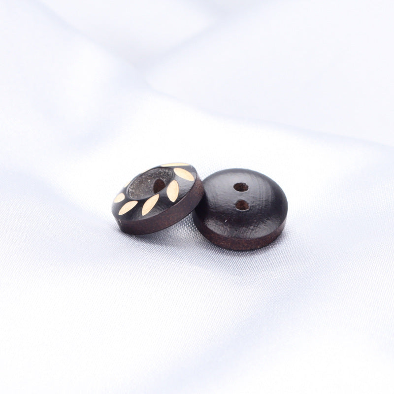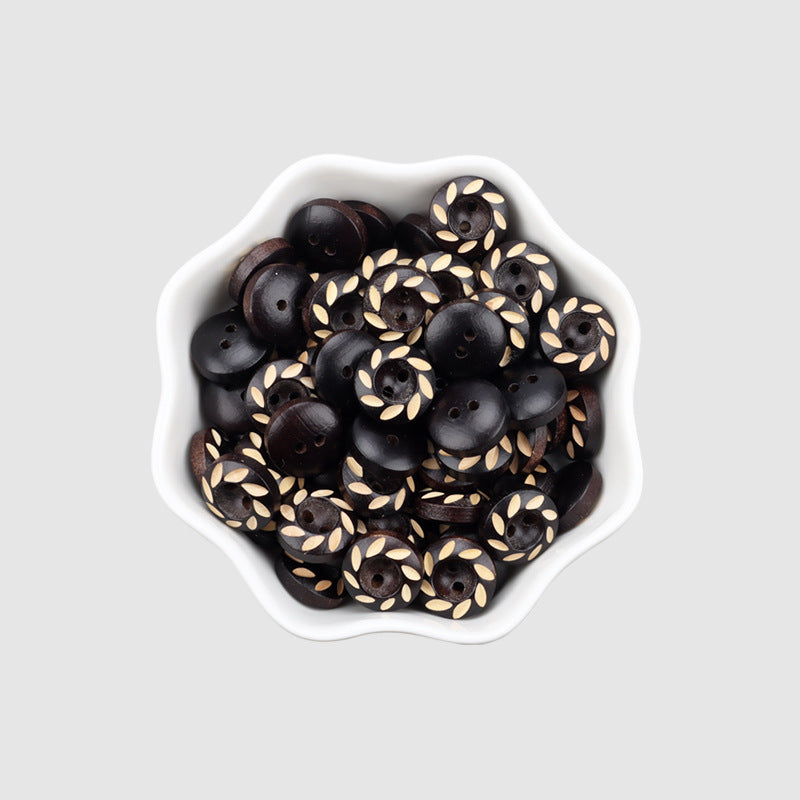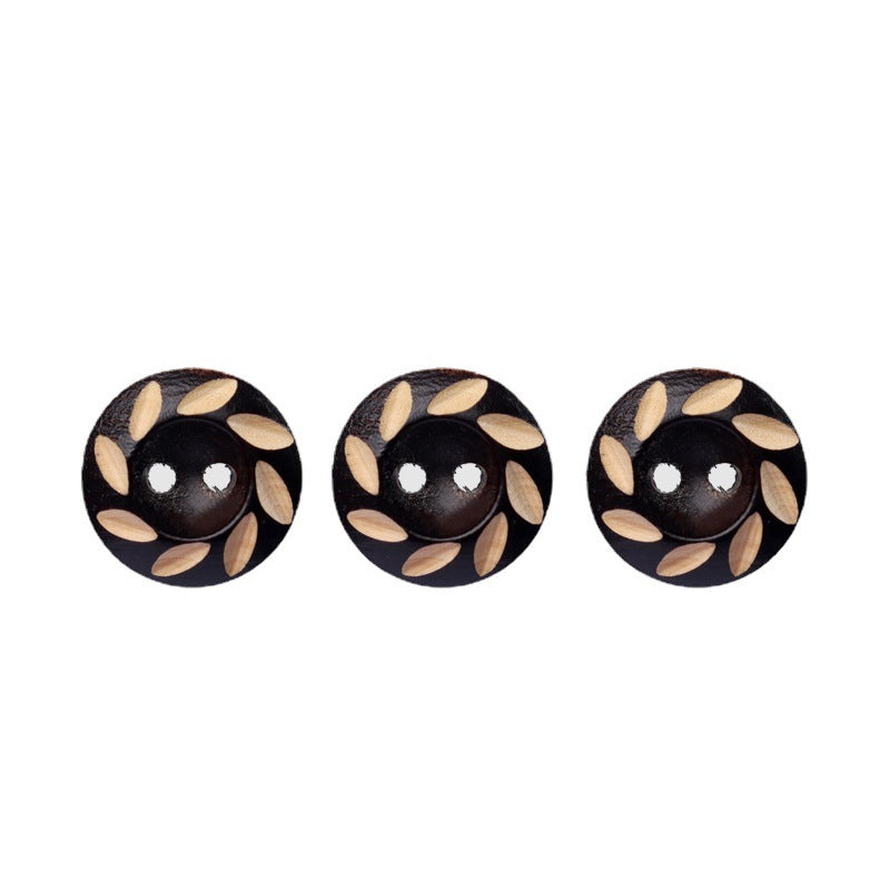 Ti okrogli gumbi premera 11,5 mm so izdelani iz naravnega lesa in imajo temno rjav lakiran zaključek. Lasersko gravirani detajli dodajo pridih prefinjenosti in edinstvenosti.