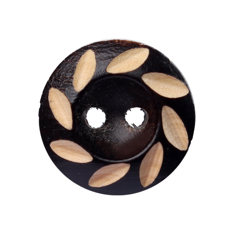 Dizajn z dvema luknjama omogoča enostavno prišivanje na različne tkanine. Temno rjava barva daje topel in eleganten videz, primeren tako za formalna kot priložnostna oblačila. Lasersko graviranje lahko sega od preprostih vzorcev do zapletenih motivov, kar povečuje estetsko privlačnost gumba.
