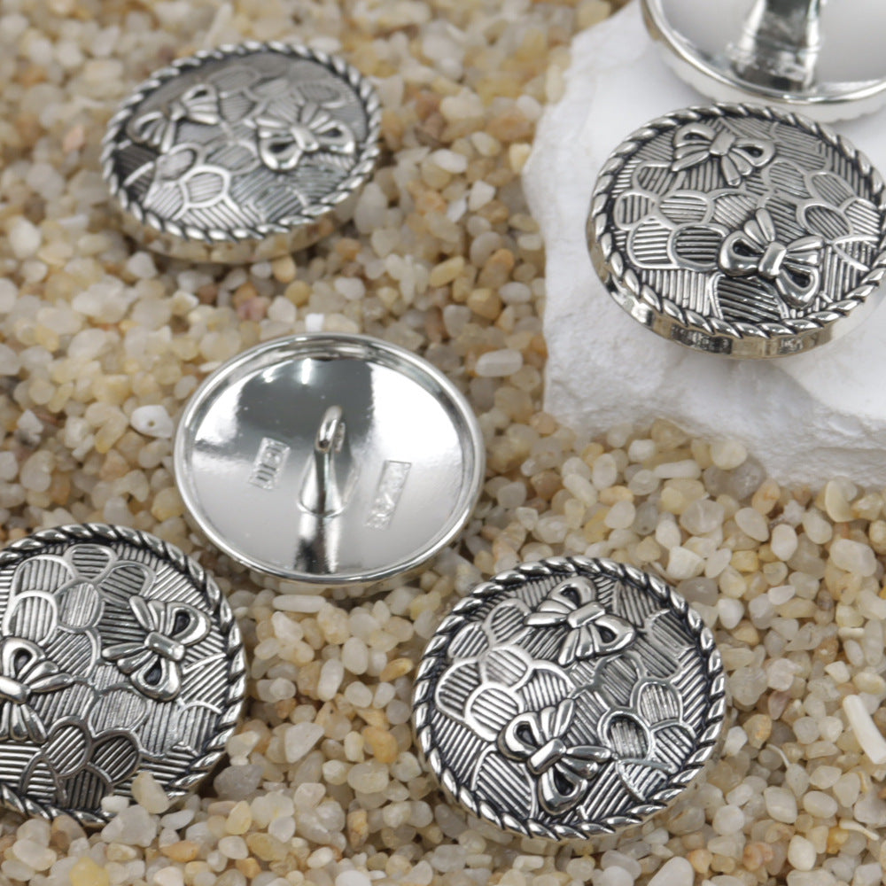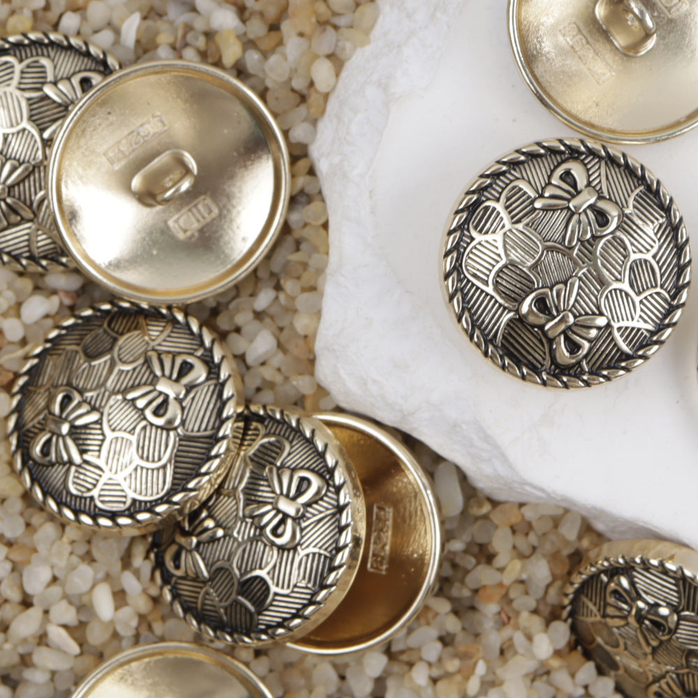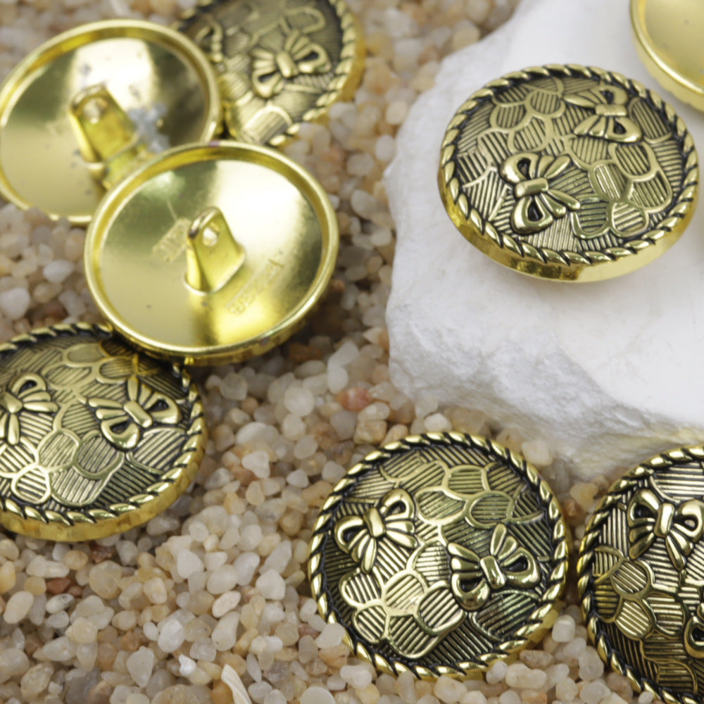 Ti gumbi, na voljo v velikostih 15/18/20/23 mm, so izdelani v starinskih zlatih, srebrnih in rožnato zlatih odtenkih z izjemnim vzorcem pentlje. Opremljeni so z zatiči, zaradi česar so primerni za različne namene.