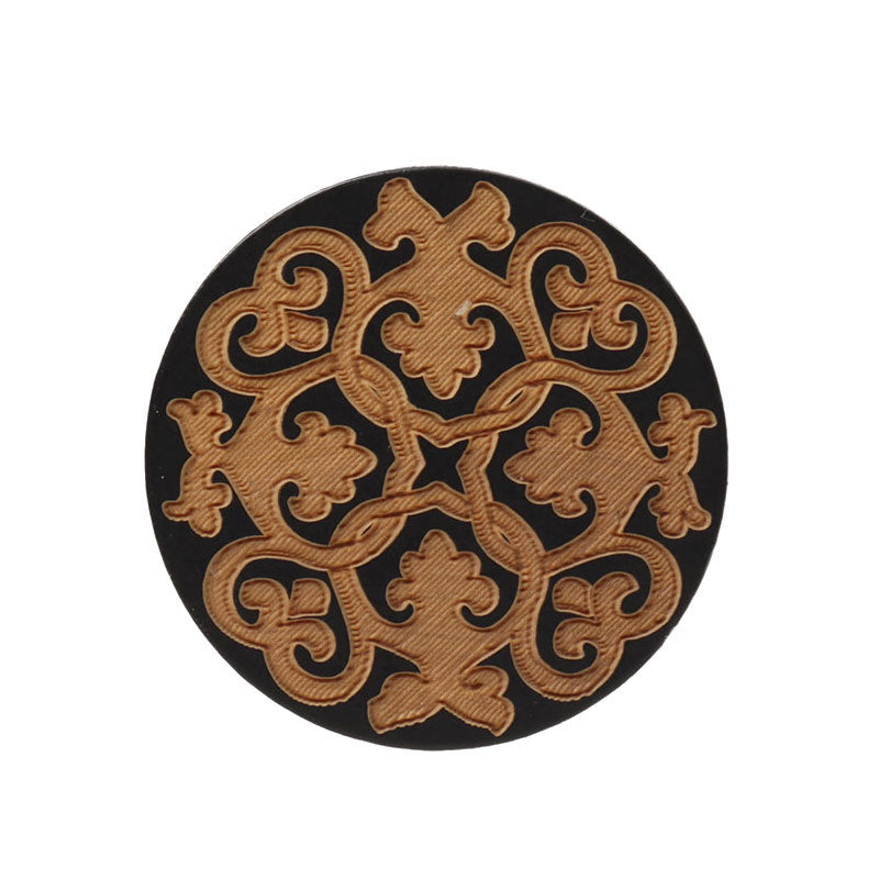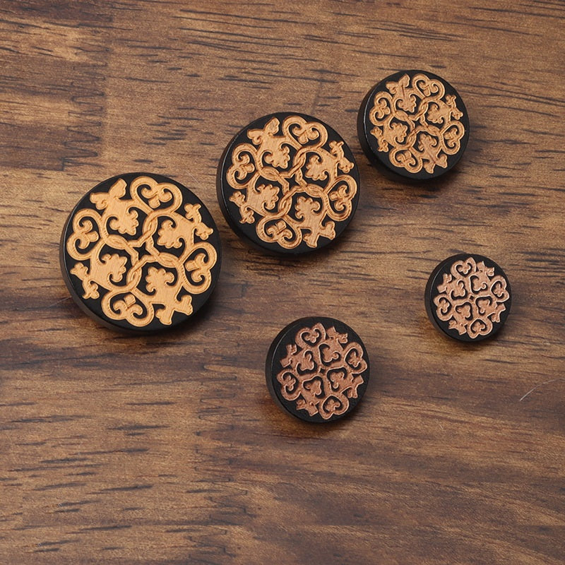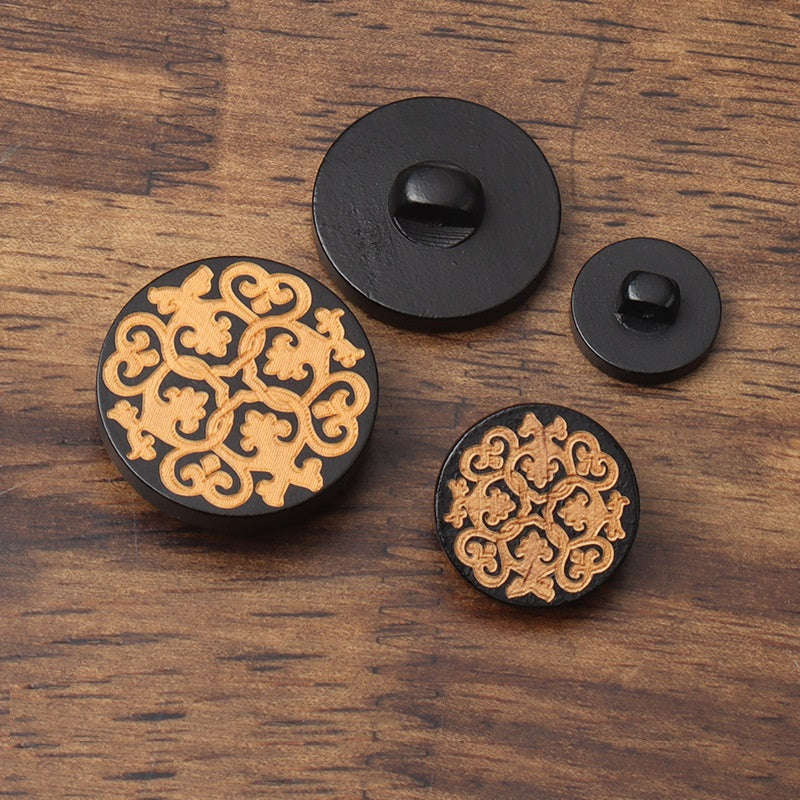 Ti okrogli leseni gumbi s stebli, velikosti 15 - 27,5 mm, so stilski dodatek različnim oblačilom. Črna barva daje eleganten in prefinjen videz, medtem ko lasersko vgravirani vzorci dodajo pridih elegance in vintage šarma.