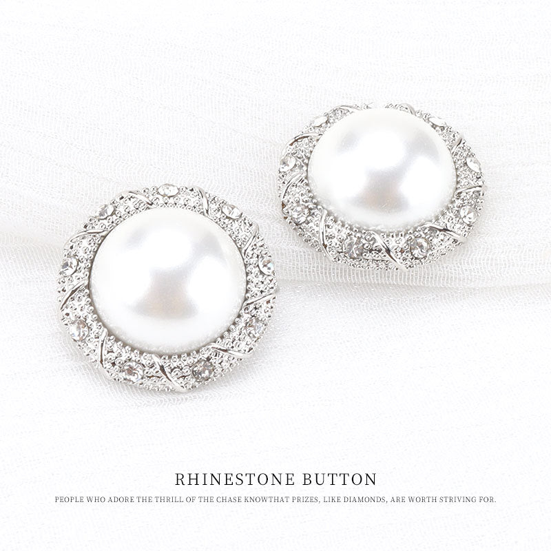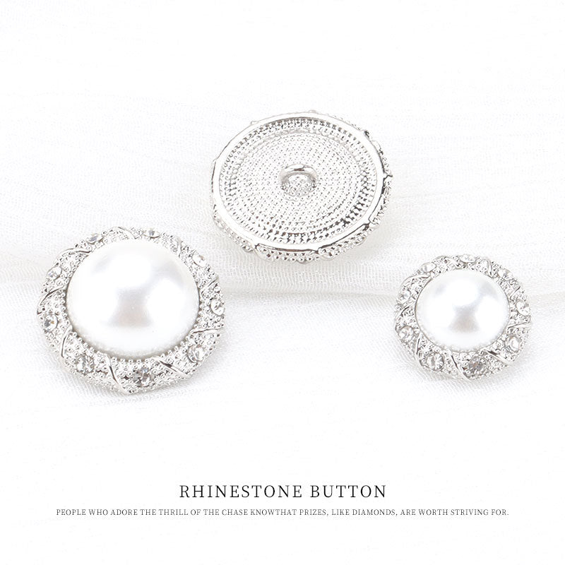 15mm okrogli robni gumb s srebrno biserno kovinsko zanko in kristalčki, 6 kosov