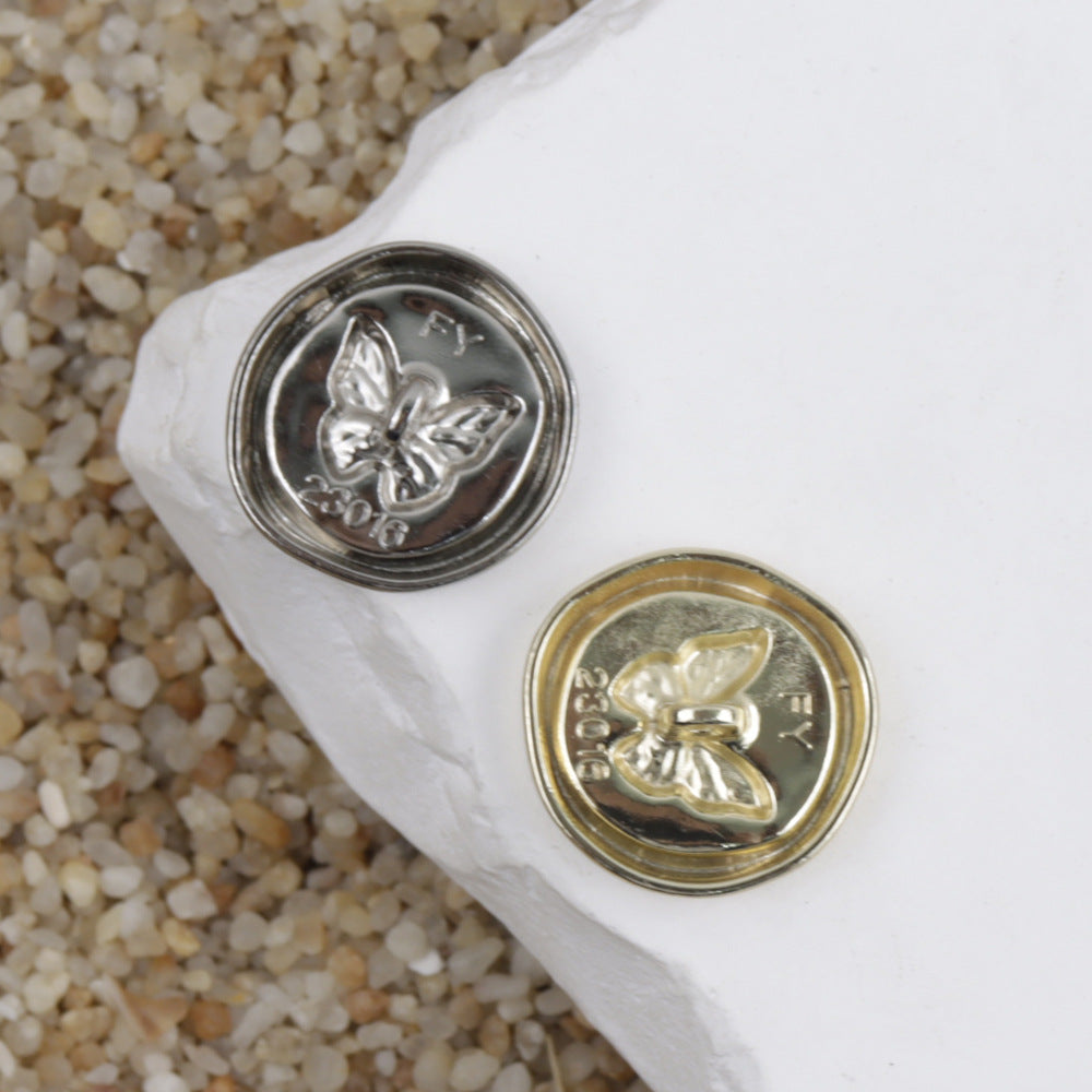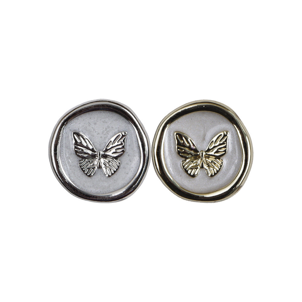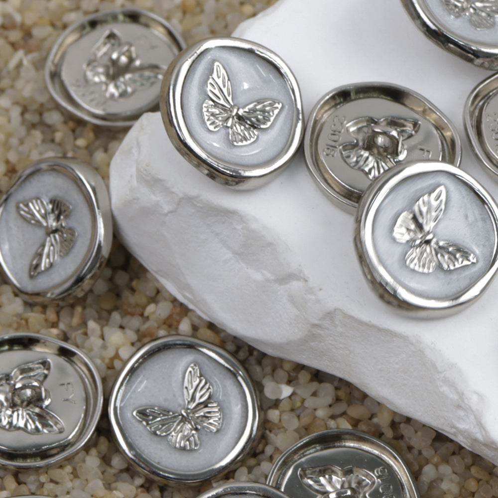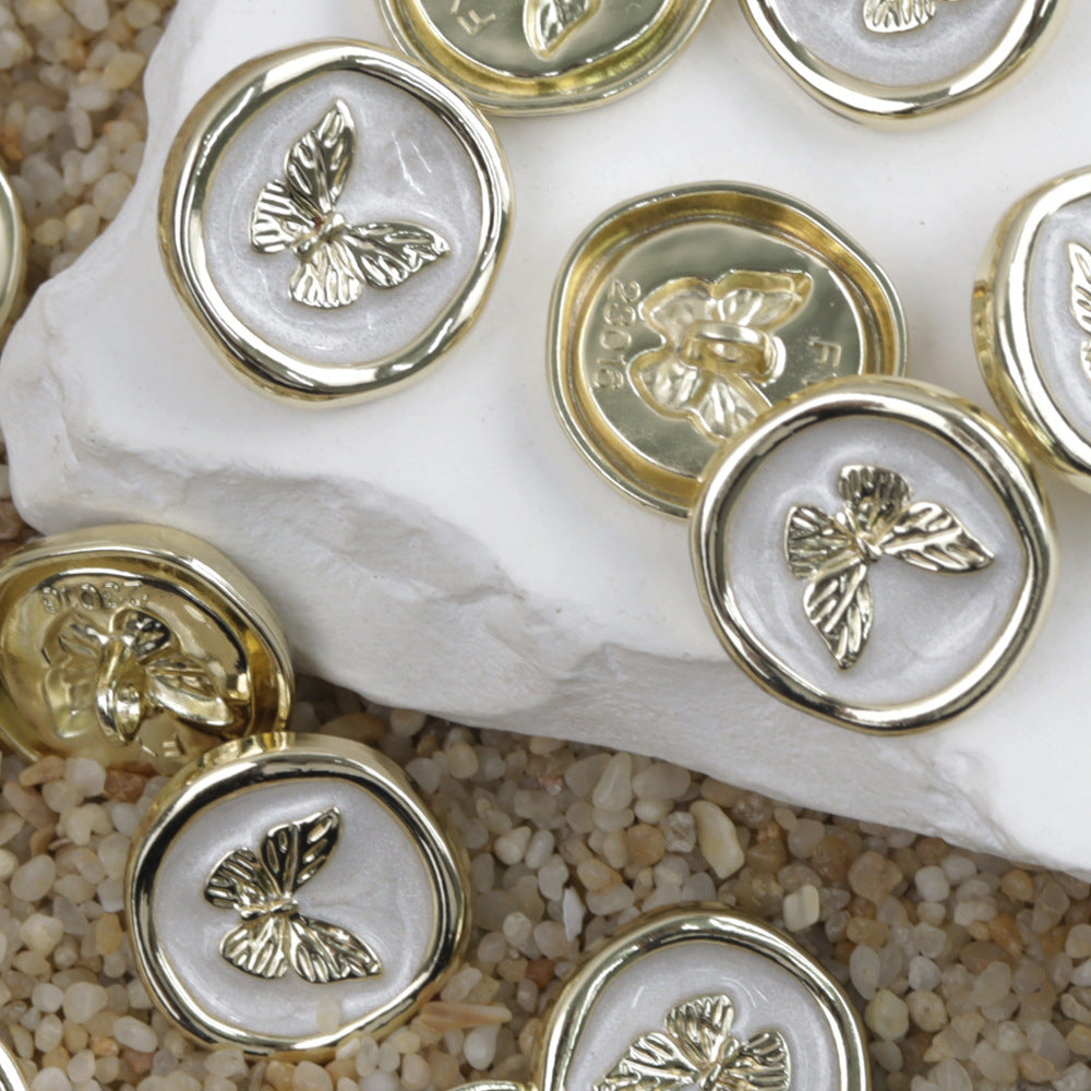 Ti gumbi, velikosti 17,5/20/23mm, so oblikovani v prikupno metuljasto obliko in so na voljo v kombinaciji srebrne in mat zlate barve. Opremljeni so z zankami, zaradi česar so popolni za izboljšanje puloverjev, kašmir puloverjev in plaščev.