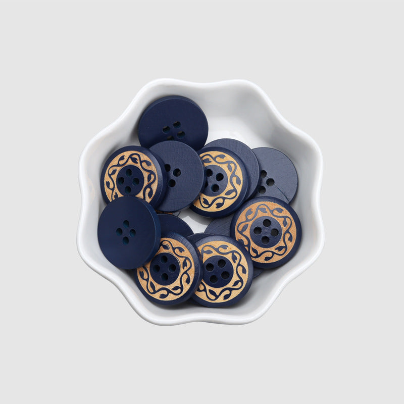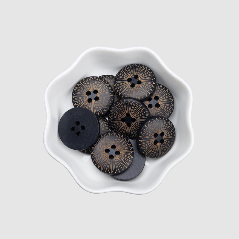 Ti 20 mm okrogli gumbi so izdelani iz topolovega lesa in predstavljajo popolno mešanico elegance in vintage šarma. Črna pečena obdelava daje gladek in poliran videz, medtem ko lasersko gravirani vintage vzorci dodajo pridih prefinjenosti.