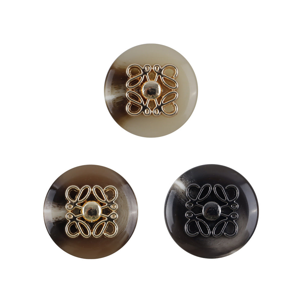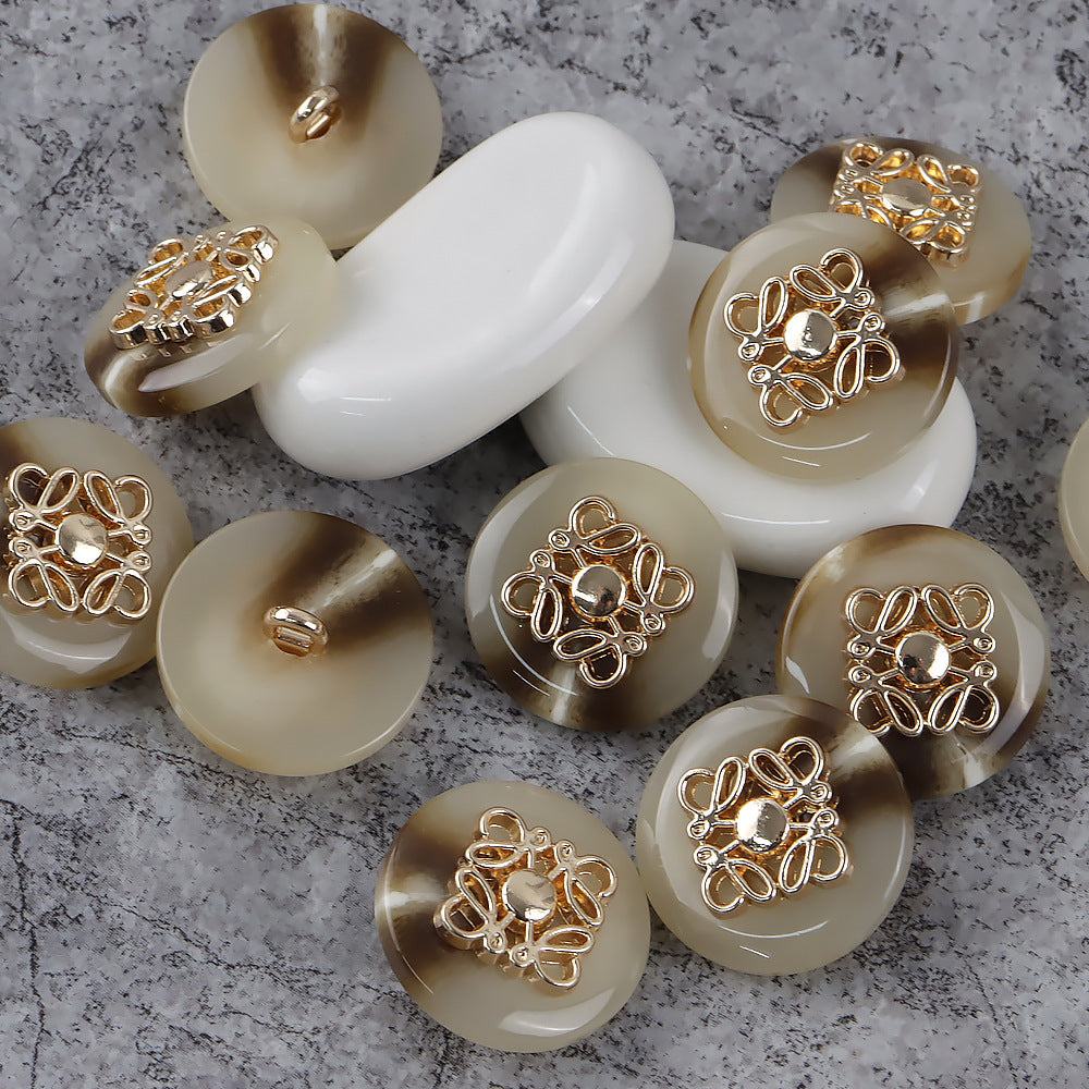 Dessa knappar, i storlekarna 17/20/23/25mm, har en unik rund form med en kombination av metall och harts. Denna design med två material ger en känsla av lyx och sofistikering. Med skaft är de speciellt utformade för kvinnors ull- och kashmirrockar.