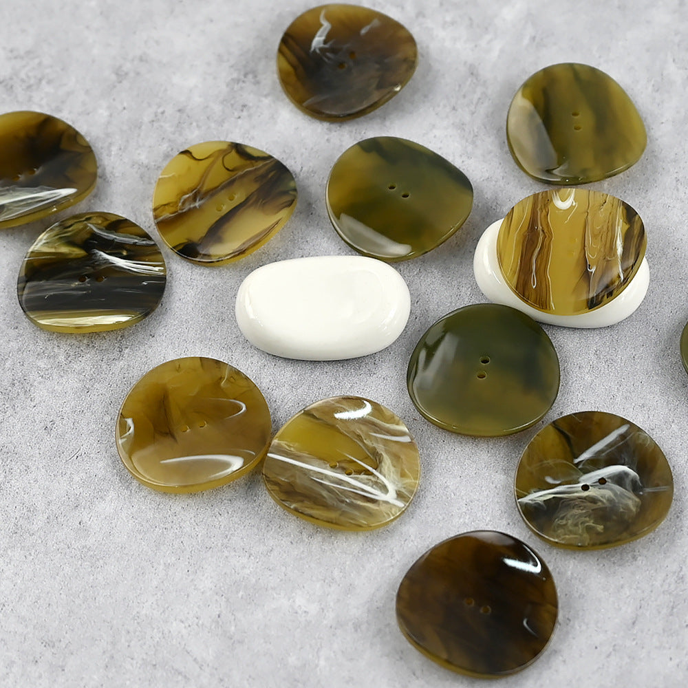 Dessa 34,4 mm hartsknappar har en unik bläcktvättsgradienteffekt i gröna-gula och mörkgröna färger, tillsammans med en böjd yta. Den stora storleken och gradientfärgerna gör dem till ett slående tillskott till varje plagg.